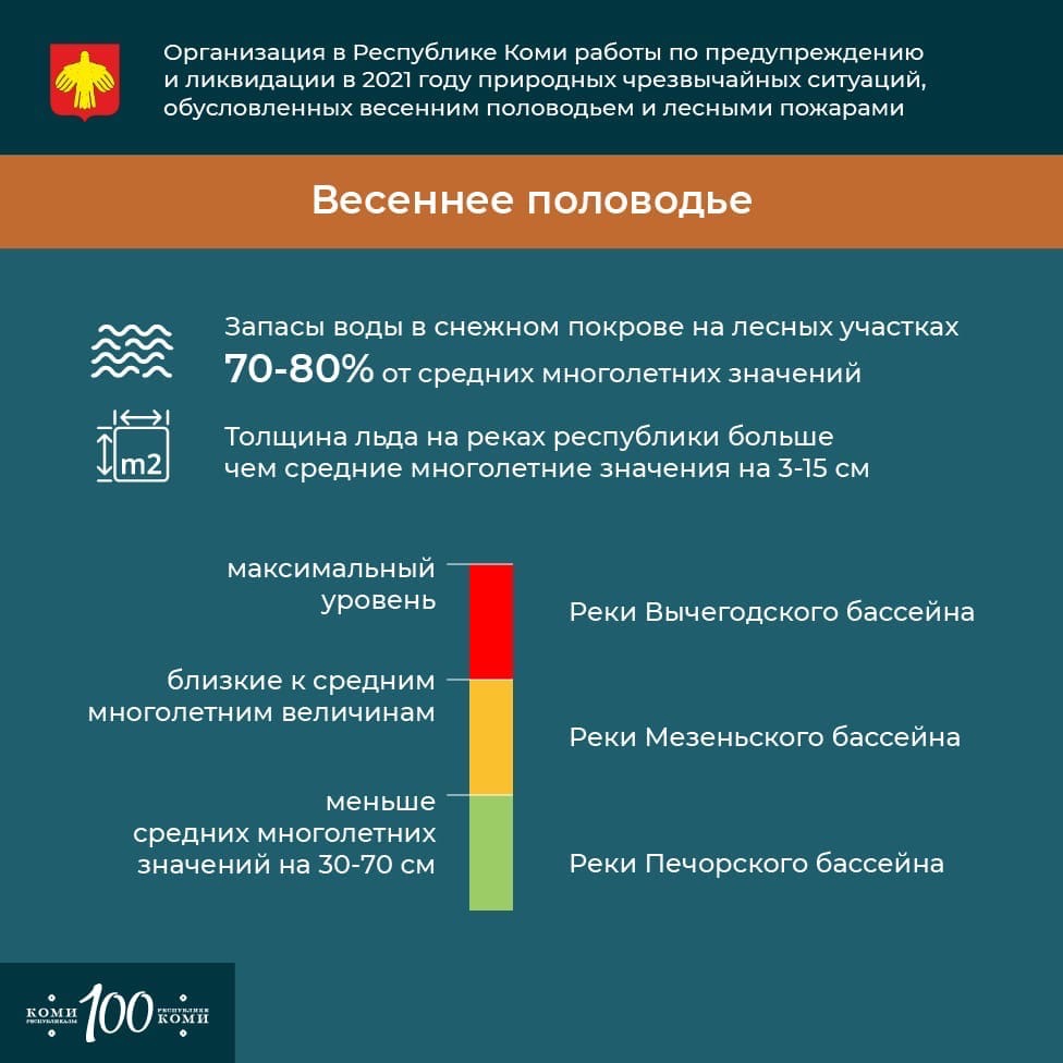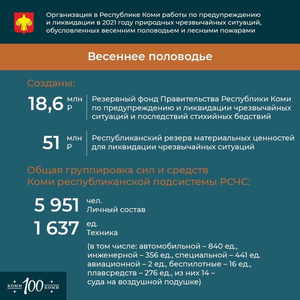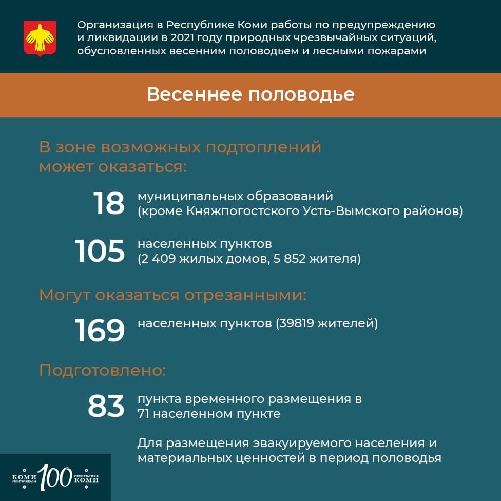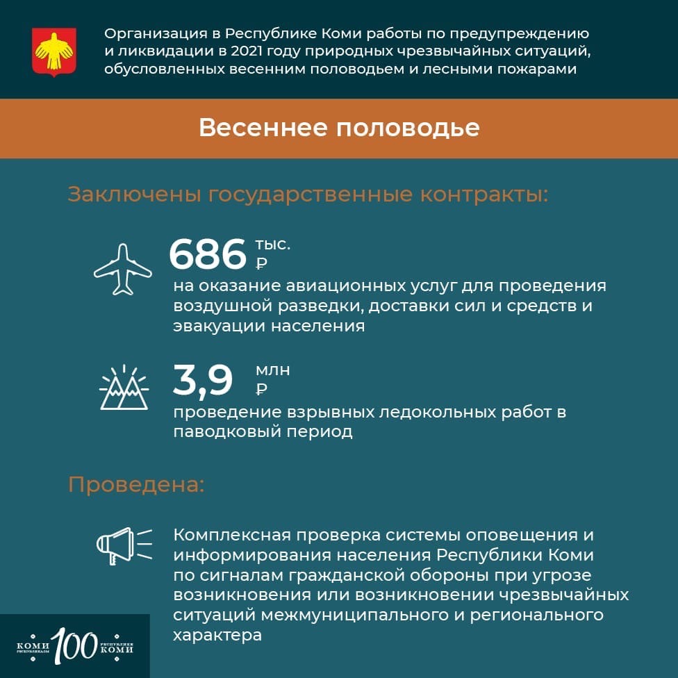 Для размещения эвакуируемого населения и материальных ценностей в период половодья - 83 пункта временного размещения в 71 населенном пункте. На оказание авиационных услуг для проведения воздушной разведки, доставки сил и средств, эвакуации населения и на проведение взрывных ледокольных работ в паводковый период заключены государственные контракты на 686 тысяч и 3,9 миллиона рублей соответственно. Проведена комплексная проверка системы оповещения и информирования населения Республики Коми по сигналам гражданской обороны при угрозе возникновения или возникновении чрезвычайных ситуаций межмуниципального и регионального характера.