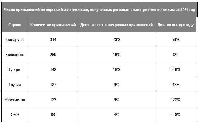 Среди топ-15 стран, из которых в 2024 было отправлено больше всего приглашений на вакансии россиянам, наиболее значимо вырос интерес к специалистам из РФ в Китае (в 2023 году было зафиксировано 4,8 тыс. приглашений, в 2024 уже 27,6 тыс., рост почти в шесть раз), Сербии (с 5,8 тыс. до 26,3 тыс. приглашений в 2024, рост почти в пять раз), Турции (с 23,5 тысячи до 67,8 тыс. приглашений, рост в три раза), на Кипре (с 4,6 тыс. до 12,0 тыс. приглашений, рост почти в три раза), в Польше (с 4,1 тыс. до 9,0 тыс., рост в два раза) и в ОАЭ (с 19,2 тыс. до 41,7 тыс., рост в два раза).