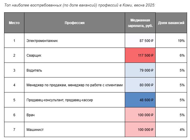 При этом самый востребованный — не обязательно самый богатый. Так, средняя зарплата электромонтажника в Коми этой весной достигла 87,5 тыс. рублей. Возможный доход водителей, которые стоят на 3 месте по востребованности, – 79 тыс., менеджеров по продажам – 80 тыс.