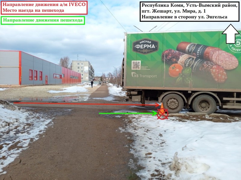 В 12:55 водитель 1989 г.р., управляя автомобилем Iveco, выезжал с дворовой территории. Возле дома №1 по ул.Мира поселка Жешарт он наехал на пешехода, который шел в попутном направлении.