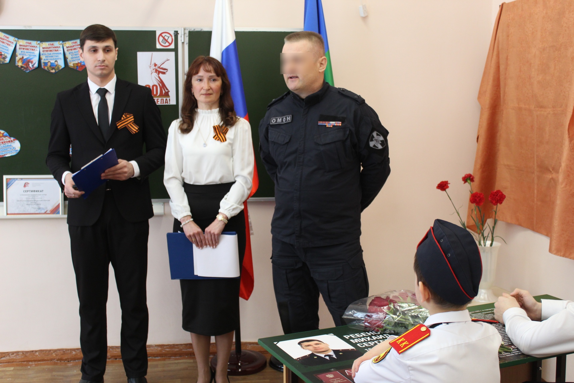 В церемонии приняли участие сотрудники ОМОН "Зырянин", военнослужащие аппарата регионального управления Росгвардии, родственники погибшего героя, педагоги и учащиеся школы.