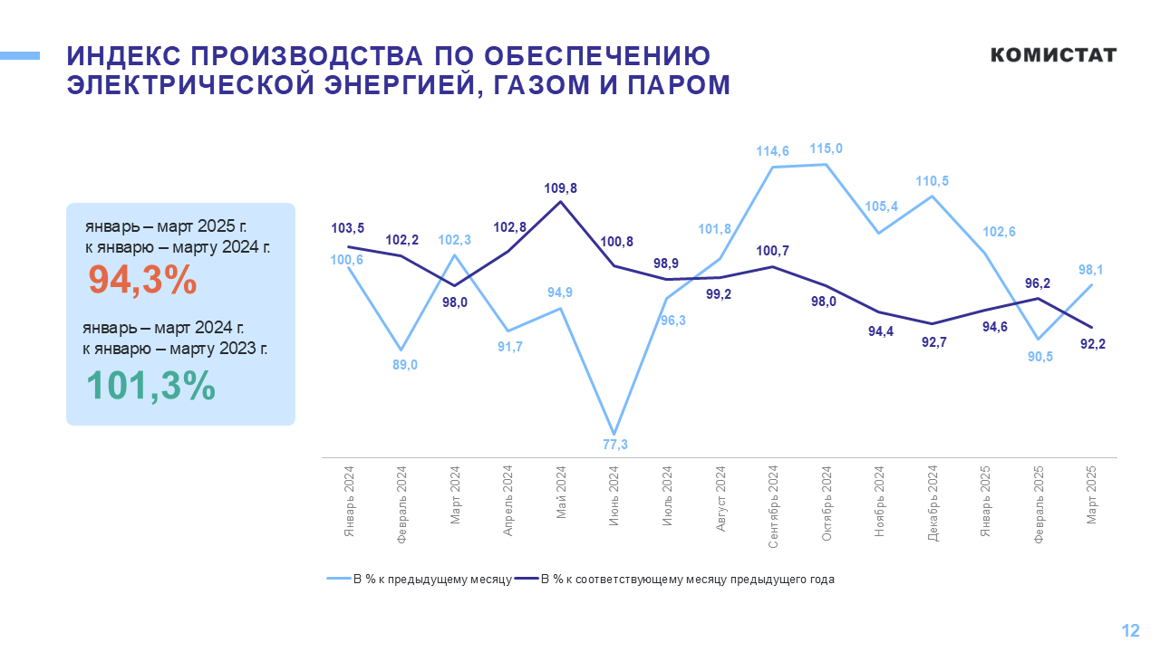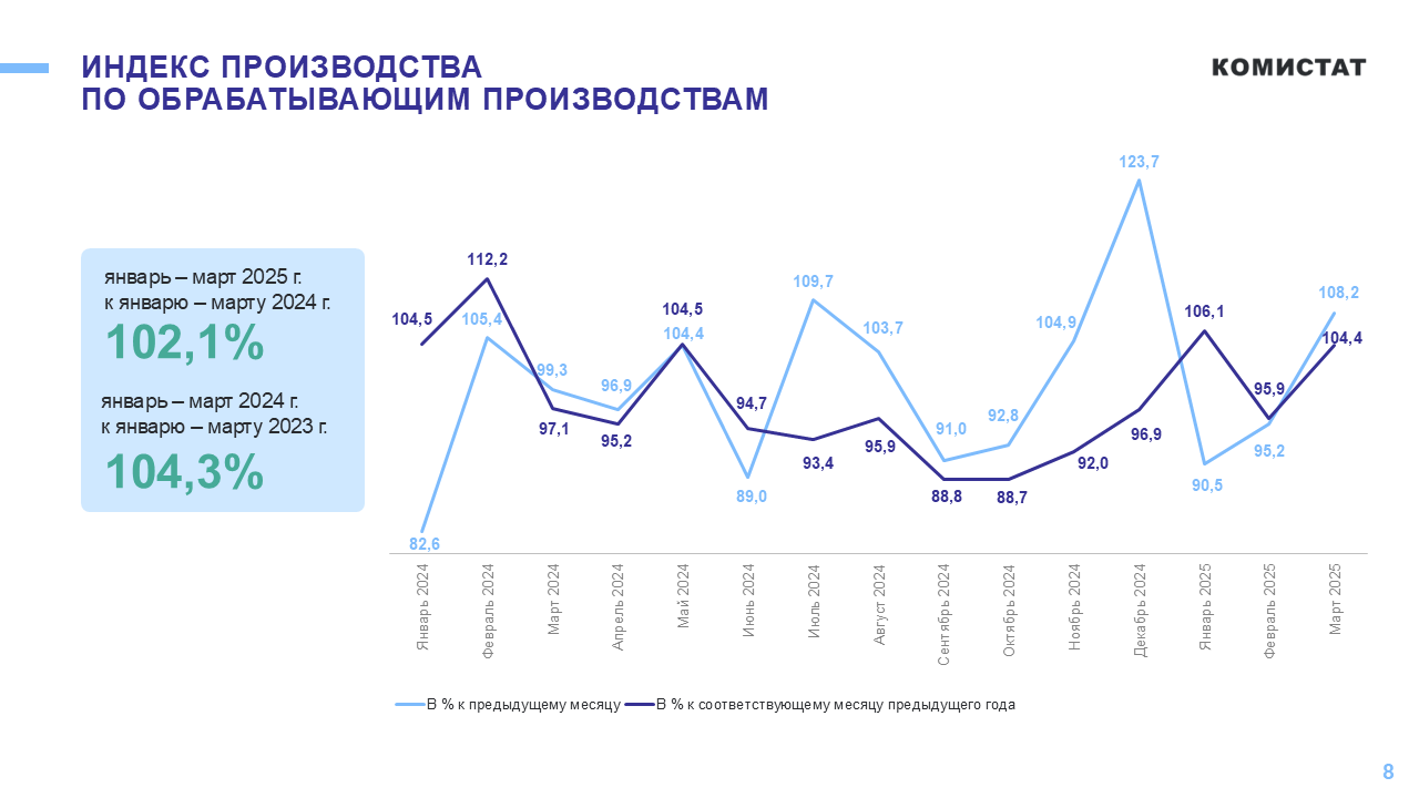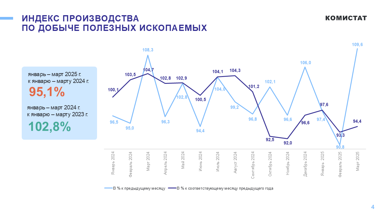 Первый квартал 2025 года ознаменовался замедлением промышленного производства в Коми. По данным Комистата, индекс промпроизводства составил всего 96,5% относительно аналогичного периода прошлого года, когда показатель достигал 102,9%.