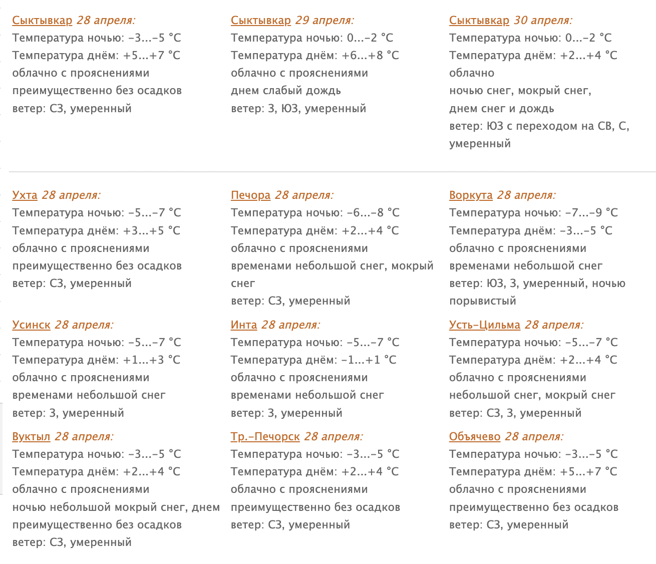 Ветер западной четверти 6-11 м/с, местами порывами до 14 м/с, ночью в Воркутинском районе юго-восточный 8-13 м/с, порывами 15-17м/с, метель. Температура ночью -3...-8°С, при прояснении до -15°С, днем +2...+7°С, на крайнем северо-востоке 0...-5°С.