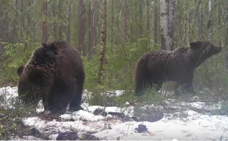 "Это была очередная попытка заснять лиса или лисицу, но на локацию пришла медведица с двумя медвежатами. Отмечу, что на это же место в мае прошлого года тоже приходила медведица. Возможно, в этом году в объектив попала именно она, однако в прошлом году она была одна", - рассказал А.Рум "Комиинформу".
