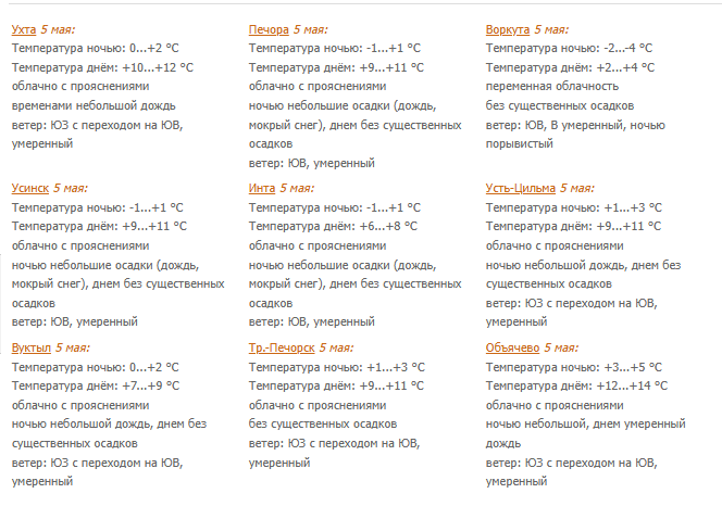 В Сыктывкаре 5 мая облачно с прояснениями. Ночью без существенных осадков, днем дождь. Ветер юго-западный с переходом на юго-восточный, ночью 4-9 м/с, днем 6-11 м/с. Температура ночью +2...+4°С, днем +12...+14°С.