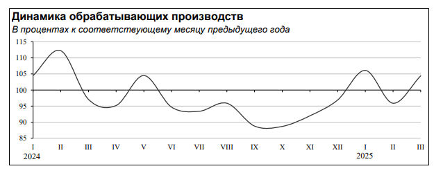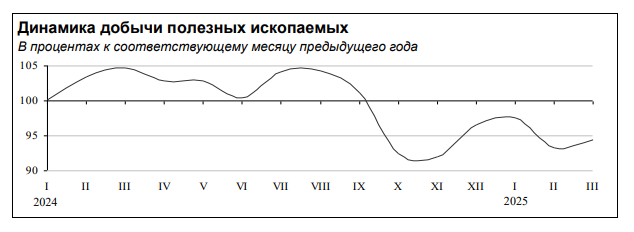 В первом квартале года в регионе также зафиксировано замедление темпов добычи полезных ископаемых. По итогам марта индекс производства в секторе добычи составил 94,4% относительно марта 2024 года. За первые три месяца 2025 года показатель снизился до 95,1%, тогда как в аналогичном периоде прошлого года он достигал 102,8%.
