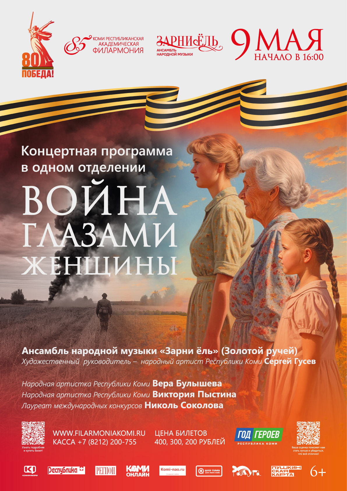 9 мая Ансамбль народной музыки "Зарни ёль" ("Золотой ручей") представит свою премьерную программу с элементами театрализации – "Война глазами женщины". Это будет рассказ о стойкости, любви и надежде, которые помогли нашим матерям, сестрам и женам пройти через самые тяжелые испытания Великой Отечественной войны. В концерте прозвучат произведения, посвящённые женским образам военной поры: песни, стихотворения и музыкальные композиции, передающие всю глубину эмоций, которые переживали женщины в годы войны. Зрители попадут в атмосферу тех лет, почувствуют боль разлуки, радость встреч и силу духа, которая помогла выжить и победить. Каждое музыкальное произведение – это история женщин, кто провожал своих любимых на фронт, ждал писем, терял близких, но продолжал верить в Победу.