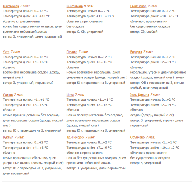 В Сыктывкаре 7 мая облачно с прояснениями. Ночью без существенных осадков, днем временами небольшой дождь. Ветер западный 5-10 м/с, днем порывами до 13 м/с. Температура ночью 0...+2°С, днем +8...+10°С.