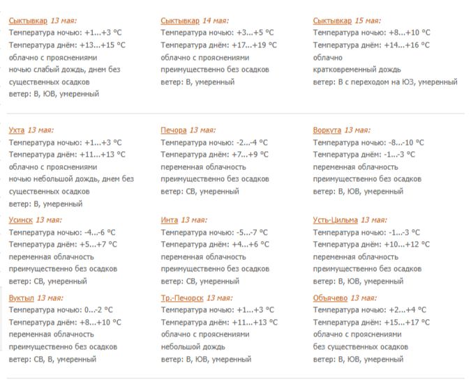 В Сыктывкаре 13 мая облачно с прояснениями, ночью слабый дождь, днем без существенных осадков. Ветер восточный, юго-восточный 3-8 м/с. Температура ночью +1...+3°С, днем +13...+15°С.