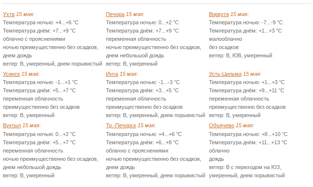 В Сыктывкаре облачно. Ночью небольшой, днем продолжительный дождь. Ветер восточный, с переходом на юго-западный 6-11 м/с, днем порывами до 14 м/с.. Температура ночью +7...+9°С, днем +10...+12°С.