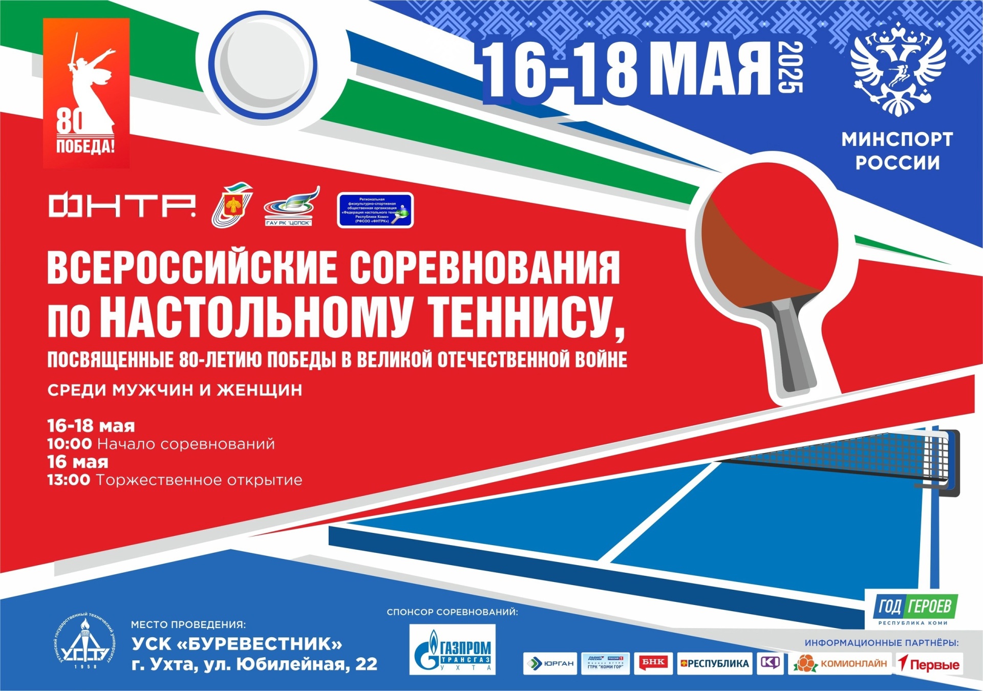 15-18 мая в 10:00 – Всероссийские соревнования по настольному теннису, посвященные 80-летию Победы в Великой Отечественной войне.