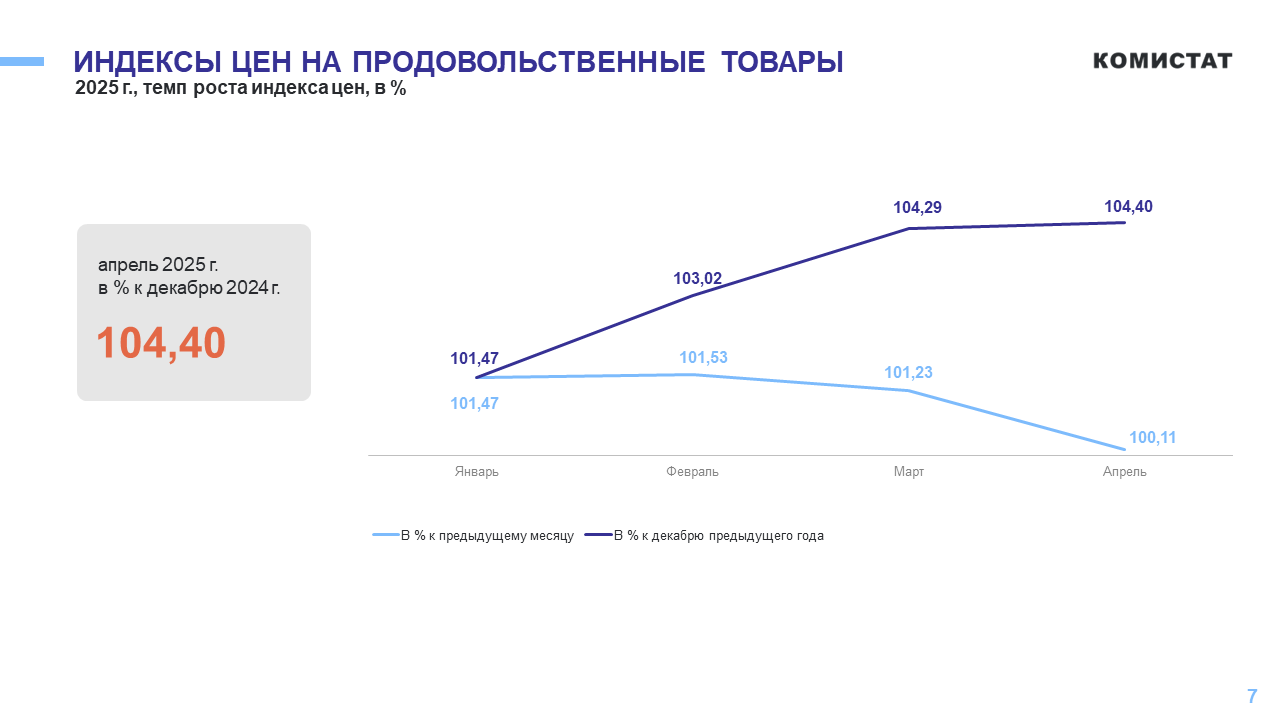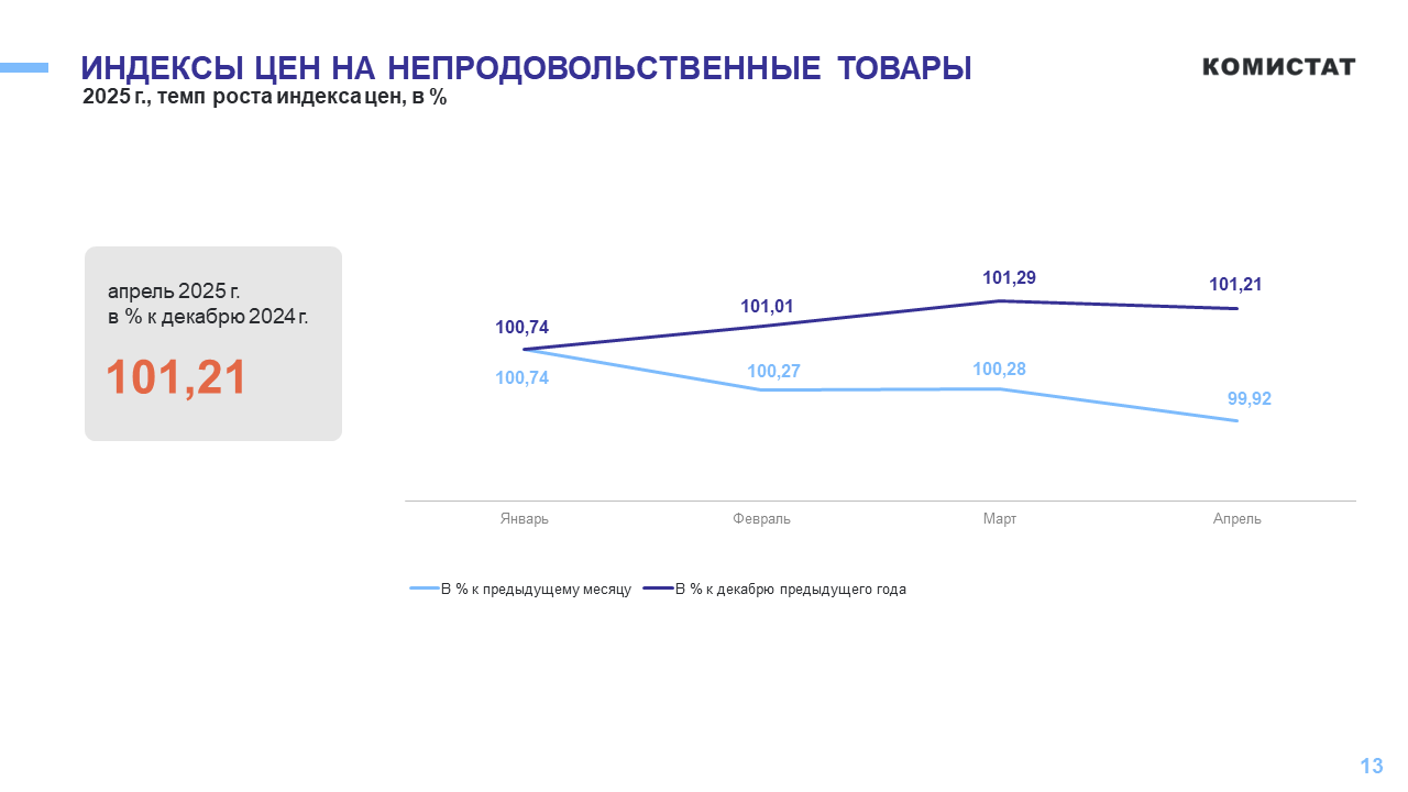 Индекс цен на непродовольственные товары составил 99,9%. В апреле в этом сегменте более всего подешевели роботы-пылесосы и микроволновые печи (-7%), при этом незначительное подорожание было зафиксировано в секторе миксеров, блендеров +3%.