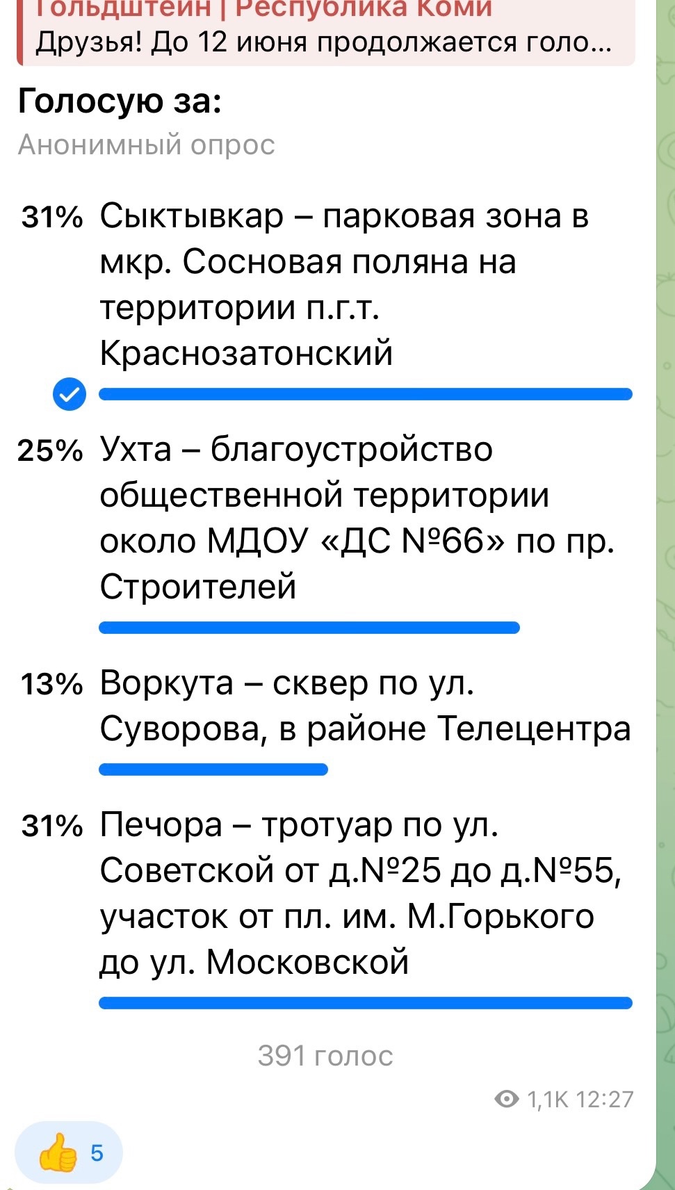 Варианты, которые выбрал для себя Р.Гольдштейн для голосования: парковая зона мкр Сосновая поляна, благоустройство общественной территории детского сада 55 по пр.Строителей в Ухте, сквер суворова в Воркуте, тротуар в печоре.