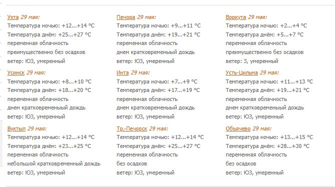 Температура ночью +12...+17°С, местами +6...+11°С, днем в южных районах +25...+30°С, в северных +18...+23°С; в Воркутинском районе ночью 0...+5°С, днем +5...+10°С.