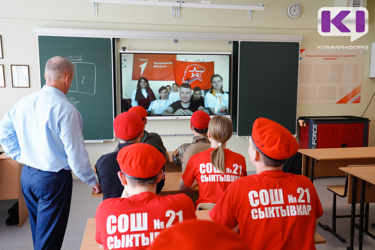 Кроме того, сыктывкарских ребят заинтересовало, как в Херсонской области развивается спорт. Николай Степанец рассказал, что в районе достаточно спортивных площадок и секций, даже развивается межрегиональное взаимодействие. В свою очередь сыктывкарские юнармейцы рассказали, что активно занимаются строевой подготовкой - и уже не в первый раз участвуют в прохождении военных расчетов во время Парада Победы на Стефановской площади.