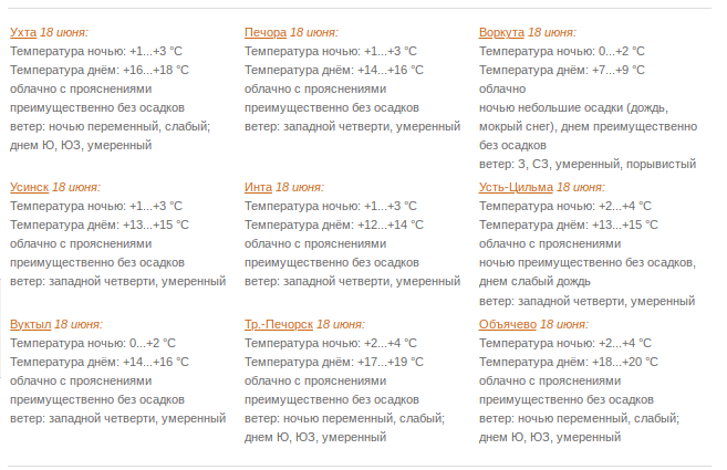 В Сыктывкаре облачно с прояснениями. Преимущественно без осадков. Ветер ночью переменный 1-5 м/с, днем южный, юго-западный 3-8 м/с. Температура ночью +2...+4°С, днем +18...+20°С.