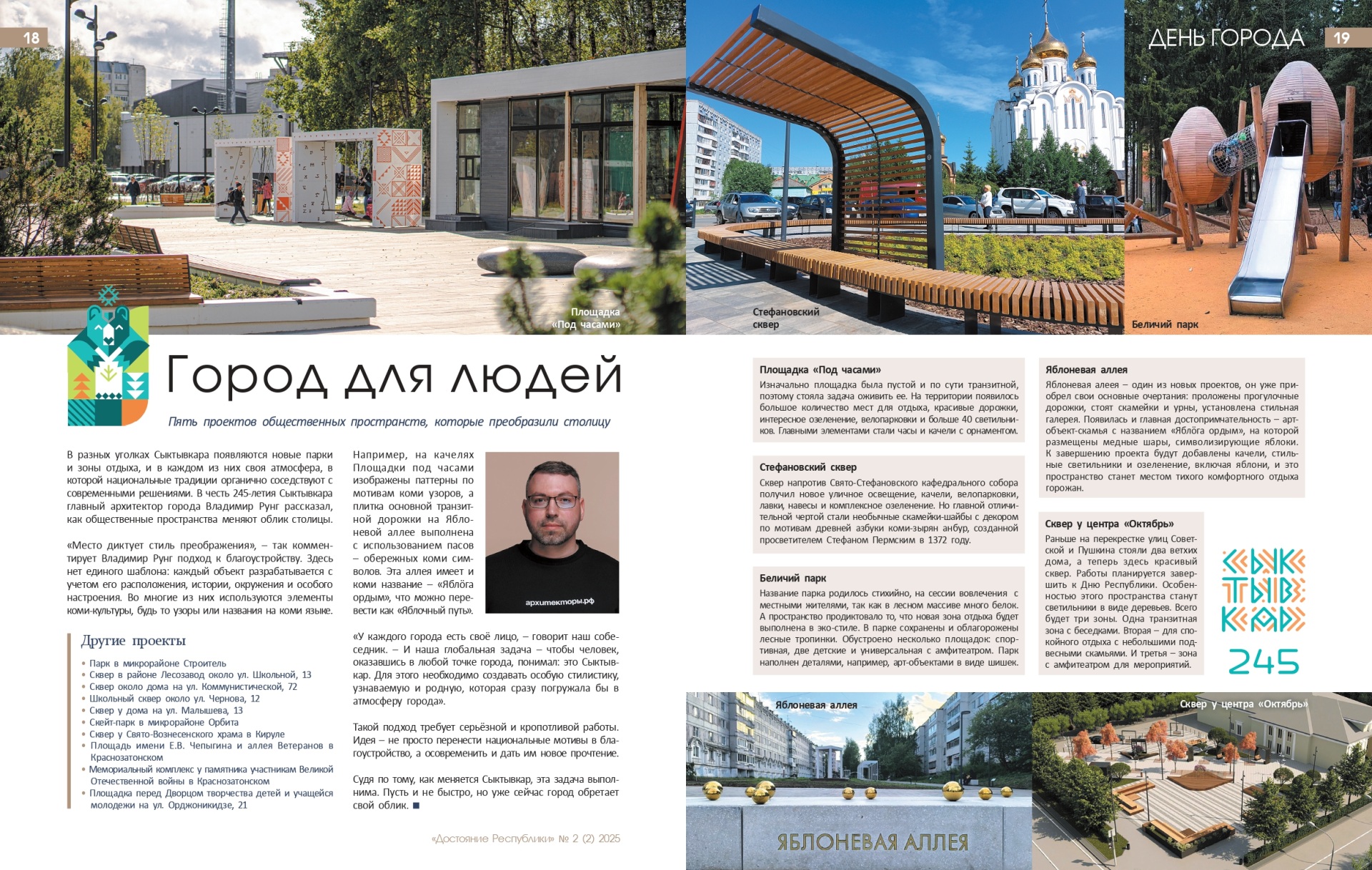 На его страницах Владимир Рунг, главный архитектор города, рассказал об общественных пространствах, которые преобразили столицу Коми, Кирилл Забалуев, генеральный директор "Коми дорожной компании", — о ремонте главной улицы Сыктывкара, а бизнес-персона выпуска Елена Чуракова, руководитель спортивного центра "Скала", — о культуре здорового образа жизни сыктывкарцев.