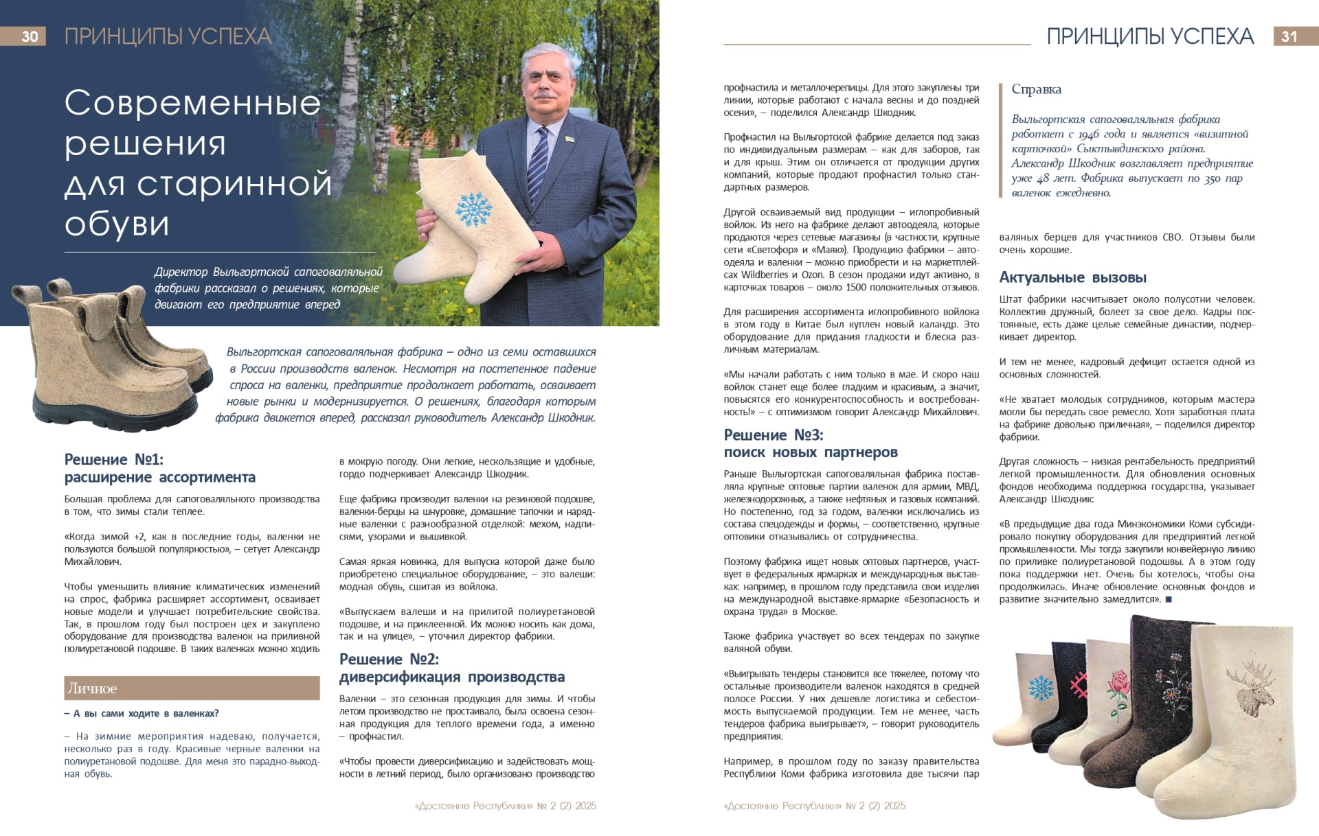Выльгортская сапоговаляльная фабрика работает с 1946 года. Несмотря на падение спроса на валенки, осваивает новые рынки и модернизируется. О трудностях сферы и их преодолении рассказал руководитель фабрики Александр Шкодник.