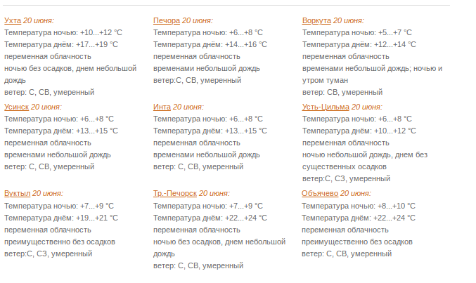 В Сыктывкаре переменная облачность. Ночью преимущественно без осадков, днем небольшой дождь. Ветер северный, северо-восточный 5-10 м/с. Температура ночью +9...+11°С, днем +20...+22°С.