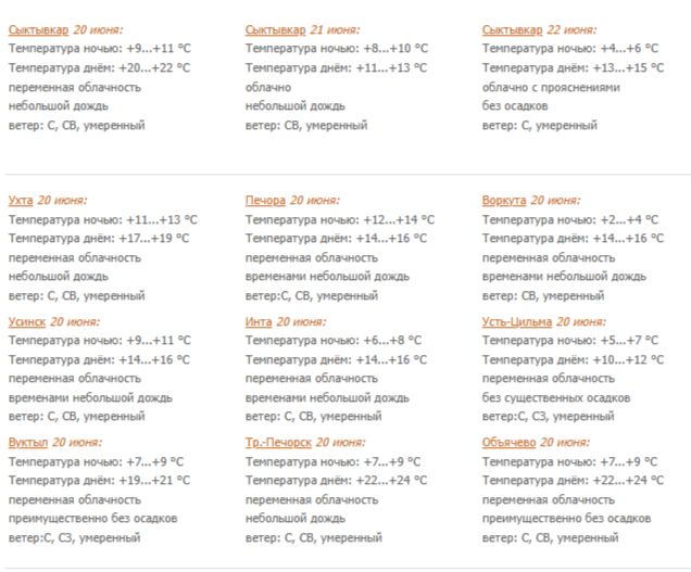 В Сыктывкаре 21 июня облачно с прояснениями. Небольшой дождь. Ветер северный 3-8 м/с. Температура ночью +7...+9°С, днем +11...+13°С.