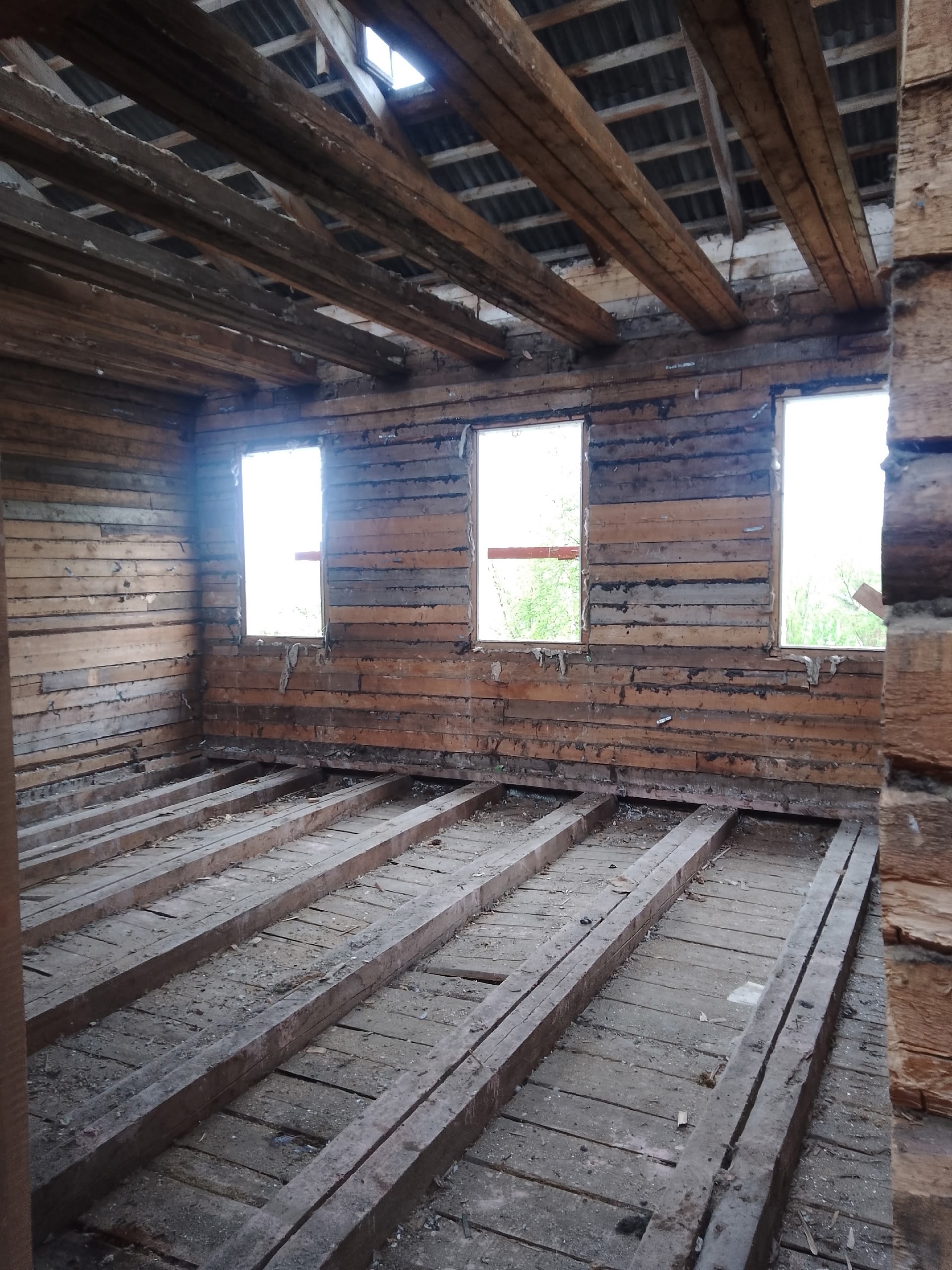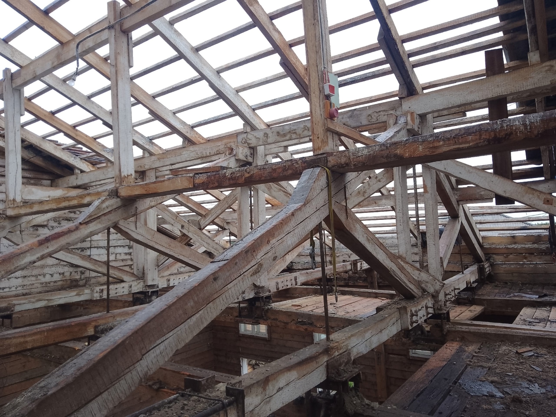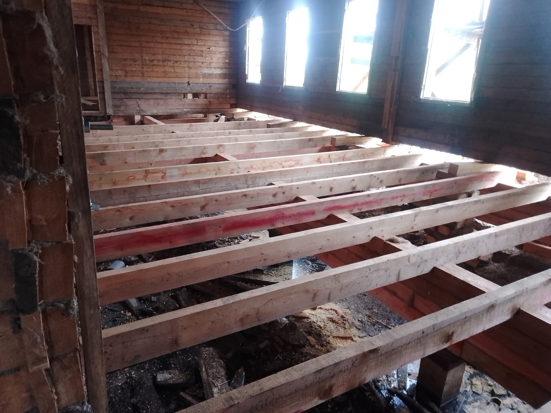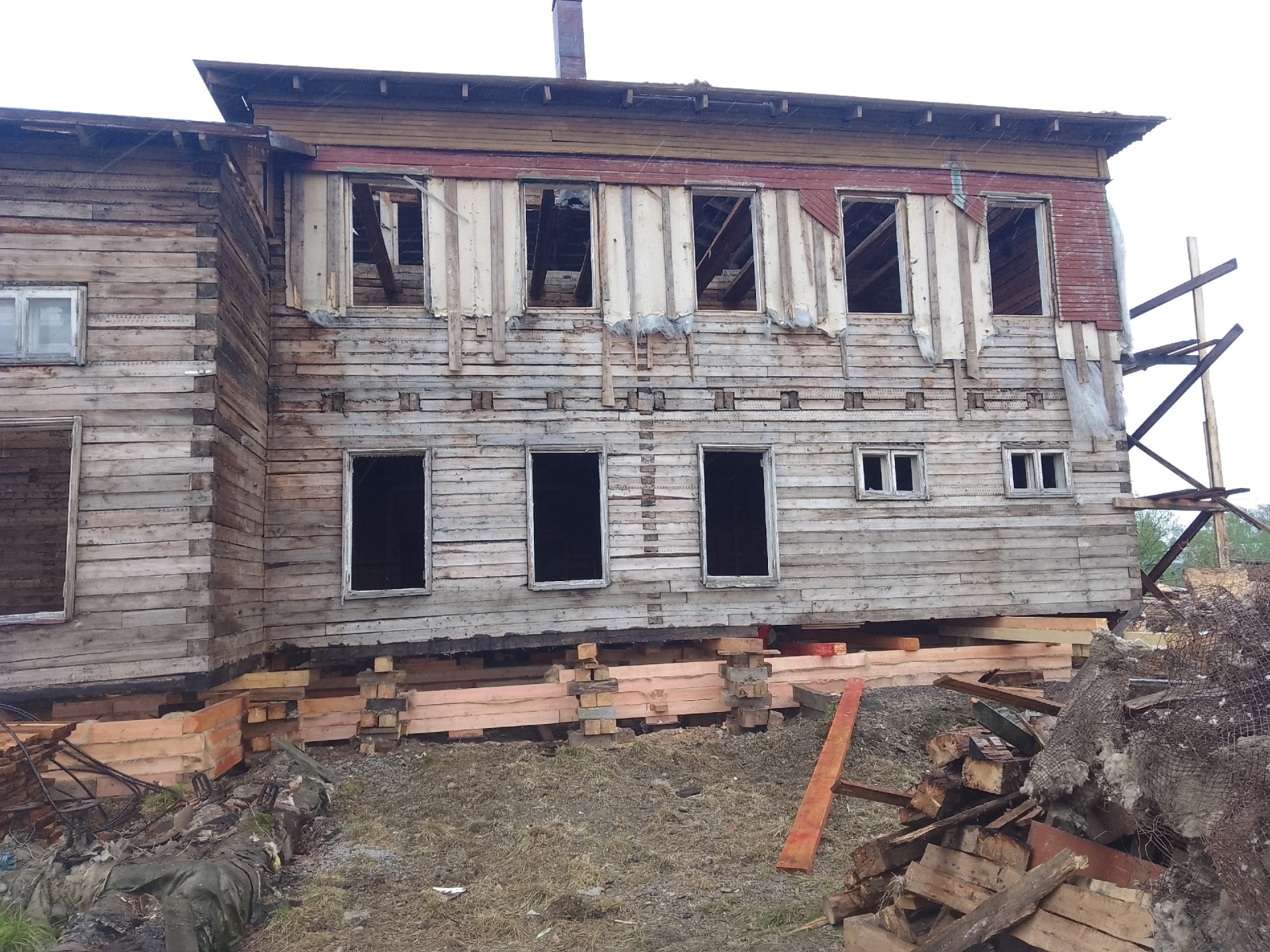 На 15 неделе с начала ремонта подрядчиком выполнены следующие работы: полная замена нижних венцов здания по периметру школы, установка лаг в кабинетах, демонтаж профнастила с северной стороны здания школы, внутренний демонтаж чердачного помещения.