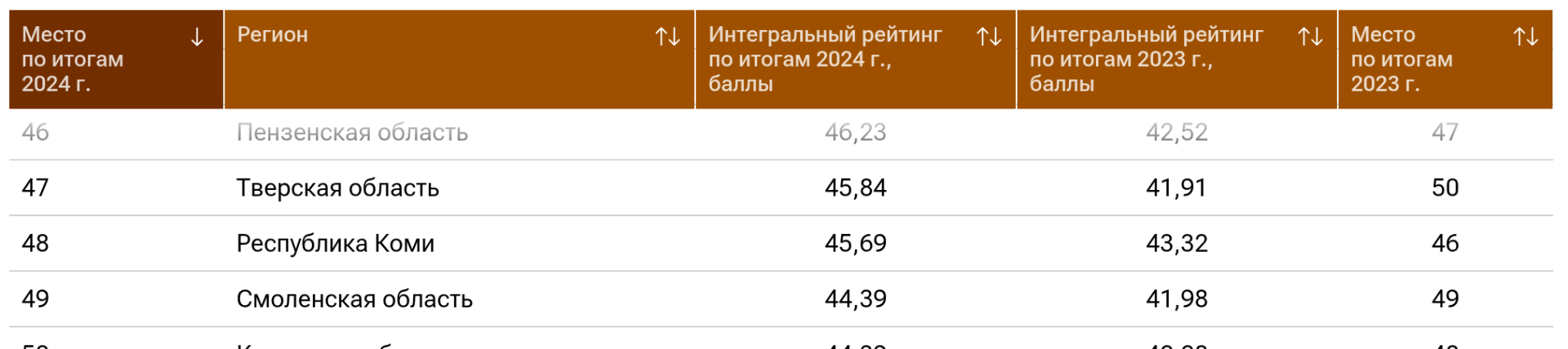 Республика набрала 45,69 балла из 100. За год регион опустился в списке на две позиции (в 2023 году Коми занимала 46-ю строчку рейтинга с показателем 43,32 балла).