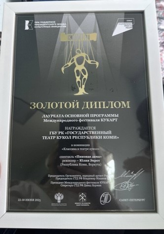 Золотой диплом лауреата в номинации "Классика в театре кукол" получил Государственный театр кукол Республики Коми за спектакль "Пиковая дама". Фестиваль-биеннале кукольных и синтетических театров проходит с 22 по 30 июня в Санкт-Петербурге, сообщает медиа-центр Минкультуры РК.