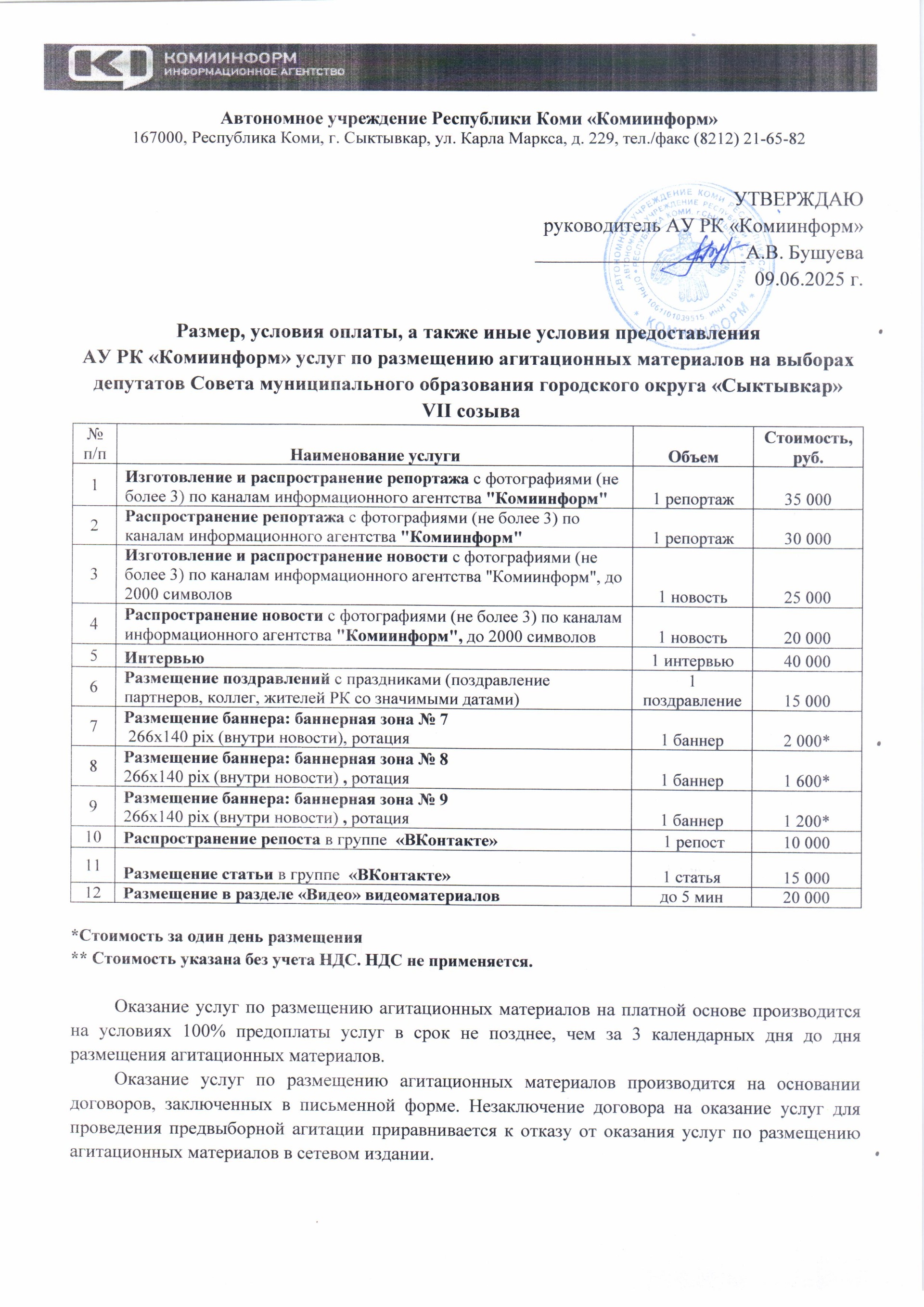 Размер, условия оплаты, а также иные условия предоставления АУ РК "Комиинформ" услуг по размещению агитационных материалов на выборах депутатов Совета муниципального образования городского округа "Сыктывкар" седьмого созыва в период предвыборной агитации с "16" августа 2025 года по "11" сентября 2025 года