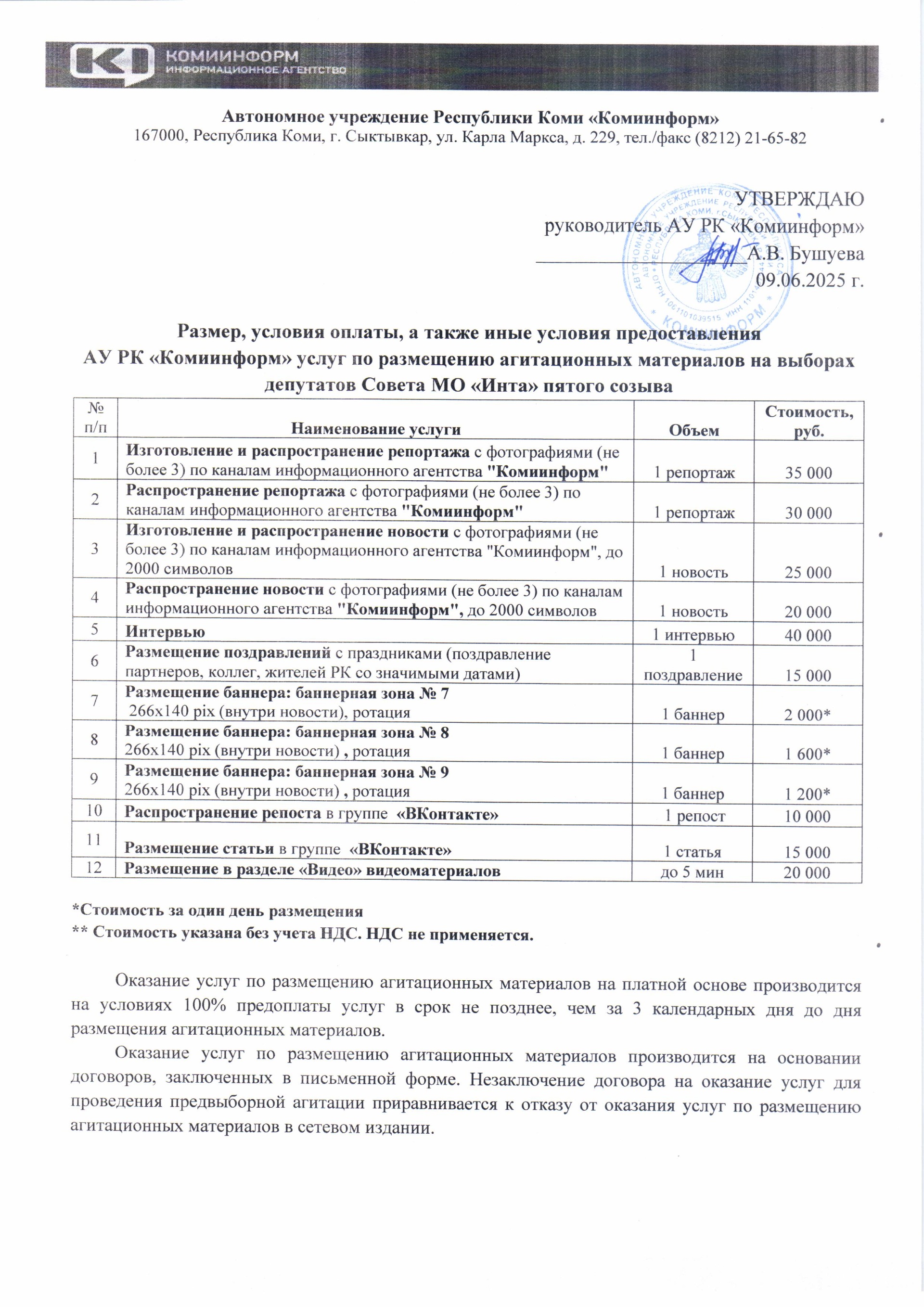 Размер, условия оплаты, а также иные условия предоставления АУ РК "Комиинформ" услуг по размещению агитационных материалов на выборах депутатов Совета муниципального округа "Инта" Республики Коми пятого созыва в период предвыборной агитации с "16" августа 2025 года по "11" сентября 2025 года