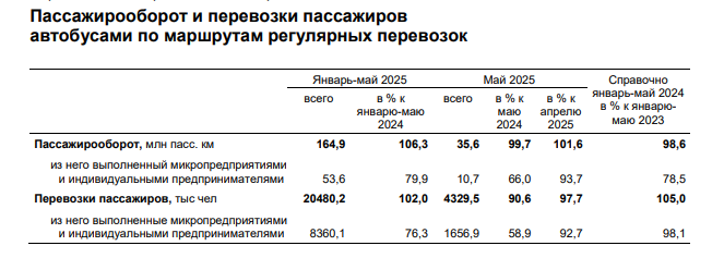 Пассажирооборот автобусов общего пользования за январь-май 2025 года увеличился на 6,3% по сравнению с аналогичным периодом прошлого года. При этом общий объем перевозок пассажиров вырос на 2%.