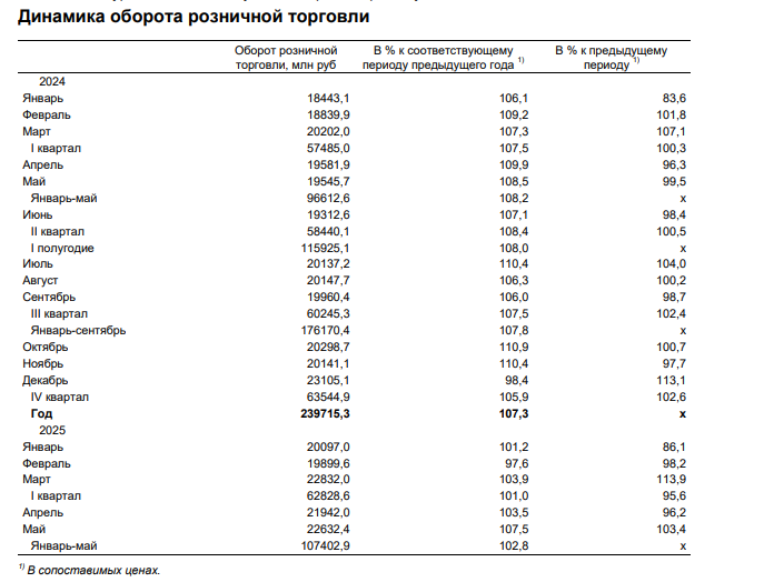 Оборот розничной торговли в мае 2025 года достиг 22,6 млрд рублей, что на 7,5% превышает показатель аналогичного периода прошлого года. За первые пять месяцев 2025 года объем продаж составил 107,4 млрд рублей (рост на 2,8% к уровню соответствующего периода предыдущего года).