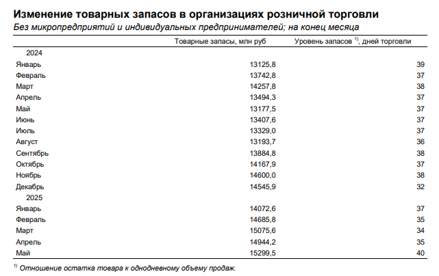 Объем товарных запасов в крупных и средних торговых организациях Республики Коми на конец мая 2025 года составил 15,3 миллиарда рублей. По данным аналитиков, текущих запасов достаточно для обеспечения торговли на протяжении 40 дней без дополнительных поставок. Показатель учитывает организации розничной торговли, исключая микропредприятия и ИП, а также торговлю автотранспортом и мотоциклами.