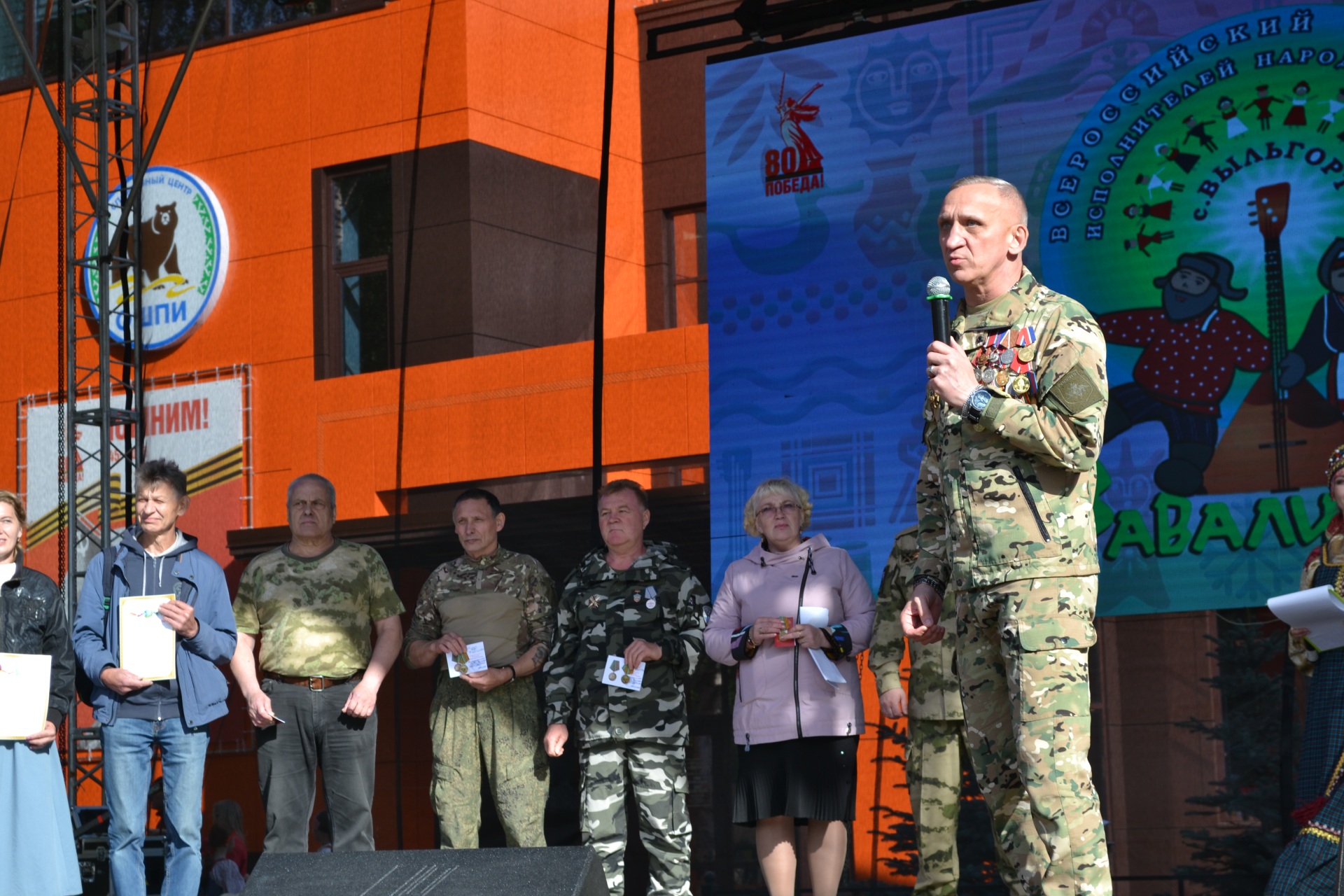 Руководитель Коми республиканского отделения Всероссийской общественной организации ветеранов "Боевое братство" Сергей Будяков обратился со сцены к зрителям фестиваля и отметил наградами тех, кто занимается гуманитарной помощью фронту.