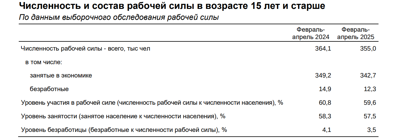 Динамика занятости демонстрирует положительную тенденцию по сравнению с аналогичным периодом прошлого года. Так, число безработных снизилось с 14,9 до 12,3 тысяч человек, уровень безработицы уменьшился с 4,1% до 3,5%, а уровень занятости населения составил 57,5%.