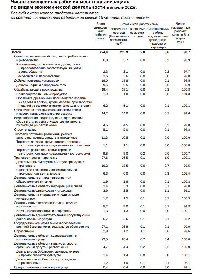 Анализ структуры занятости в крупных организациях (с численностью работников более 15 человек) показал, что в апреле 2025 года из общего числа замещенных рабочих мест 215,9 тысячи человек (96,2%) работали по основному месту работы, а 8,4 тысячи человек (3,7%) были заняты на условиях совместительства или по гражданско-правовым договорам. "Наибольшая доля рабочих мест внешних совместителей и лиц, выполнявших работы по гражданско-правовым договорам, наблюдалась в финансовой и страховой деятельности (31%), в деятельности в области спорта, отдыха и развлечений (13%)", - сообщает источник.
