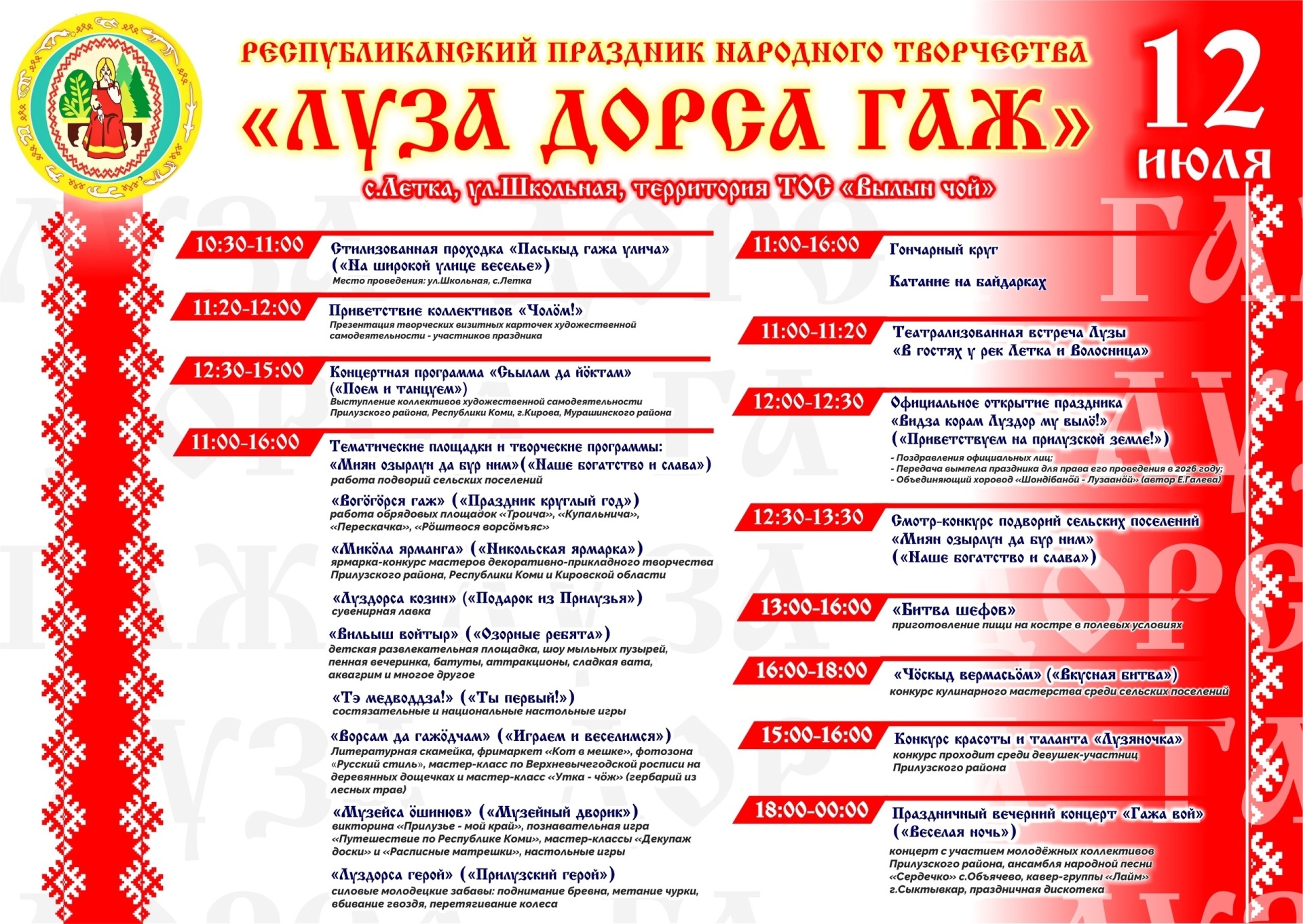 12 июля в селе Летка пройдёт республиканский праздник народного творчества "Луза дорса гаж". Это традиционное этнокультурное событие, которое ежегодно проходит в разных населённых пунктах Прилузского района.