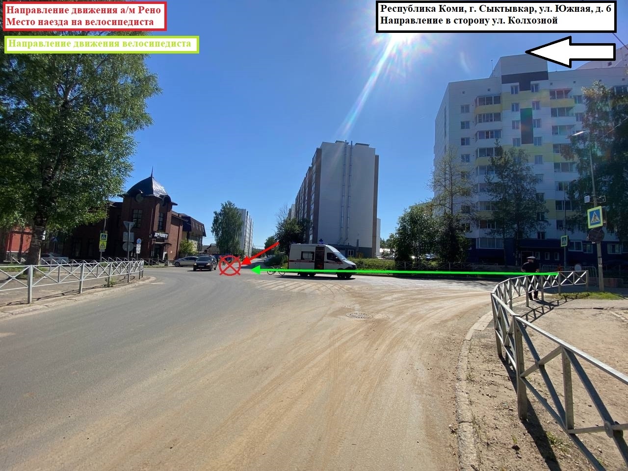 Первое ДТП произошло около 13:11. Водитель 1981 года рождения за рулем Renault Logan ехал по улице Домны Каликовой со стороны улицы Мичурина в направлении улицы Южной. На нерегулируемом перекрестке улиц Домны Каликовой и Южной водитель не уступил дорогу. В результате он совершил наезд на велосипедиста, который двигался по главной дороге улицы Южной со стороны Сысольского шоссе в направлении улицы Колхозной.
