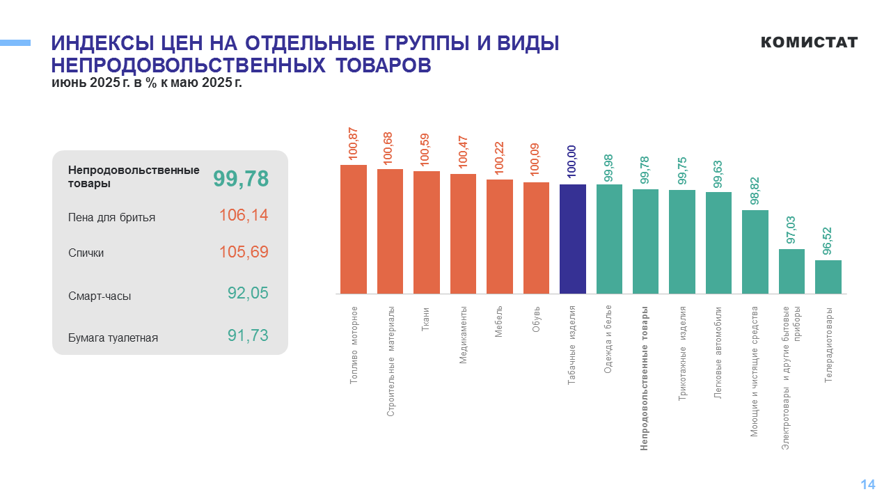 В сегменте непродовольственных товаров индекс цен составил 99,8%. Значительное снижение коснулось бытовой техники: смарт-часы подешевели на 8%, электропылесосы напольные — на 7%, ноутбуки и стиральные машины — на 6%. Среди товаров первой необходимости наблюдалась разнонаправленная динамика: туалетная бумага снизилась в цене на 8%, в то время как спички подорожали на 6%.