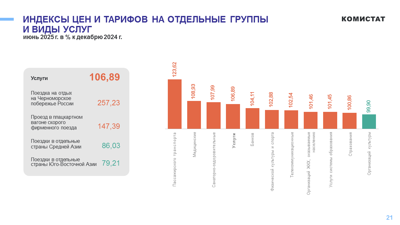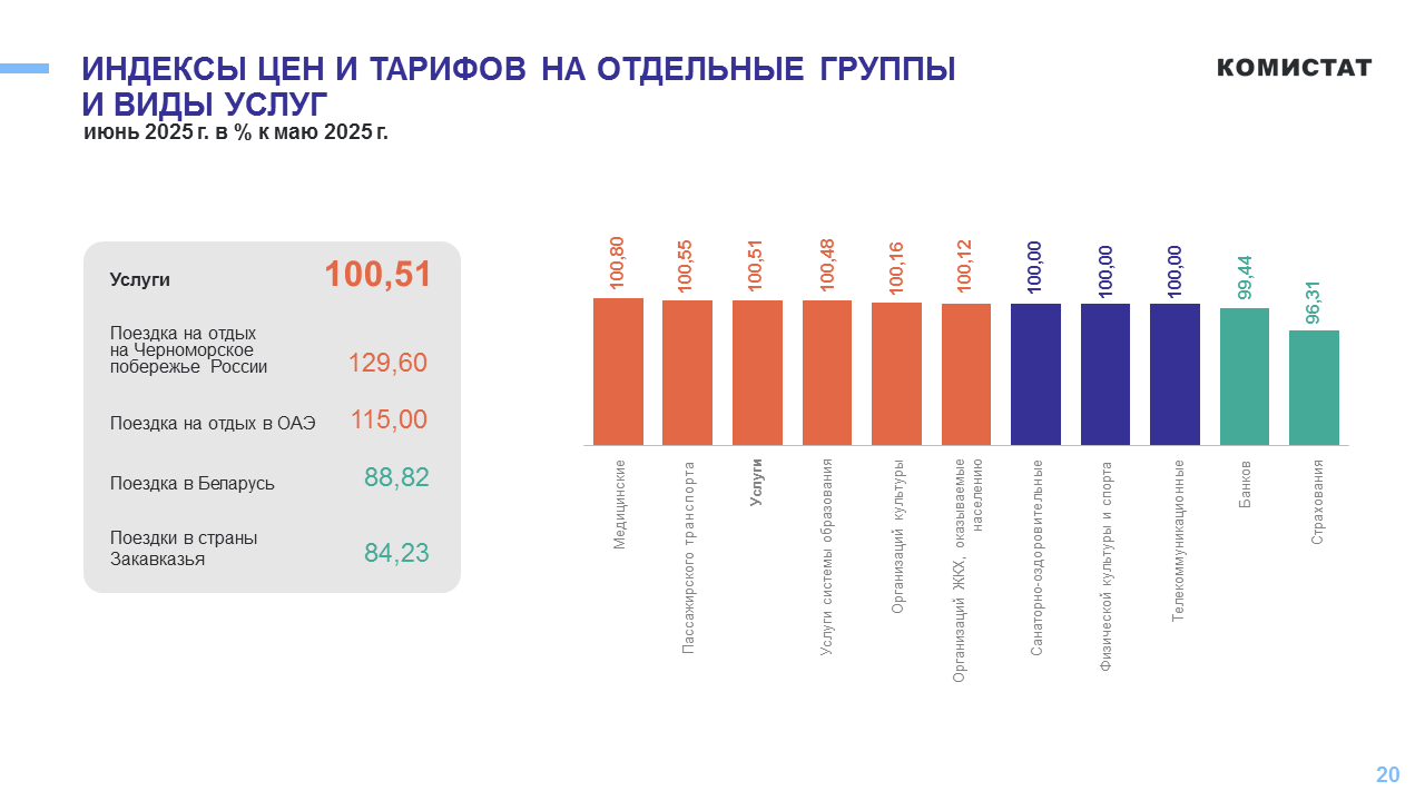 В сфере услуг индекс цен составил 100,5%. Существенный рост отмечен в туристическом сегменте: стоимость отдыха на Черноморском побережье России увеличилась на 30%, туры в ОАЭ подорожали на 15%. Зато снизились цены на поездки: в страны Закавказья (-16%), Беларусь (-11%), Египет (-3%), Турцию (-1%). Медицинские услуги показали умеренный рост: пребывание в стационаре подорожало на 5%, консультативный прием врача — от 1% до 2%.