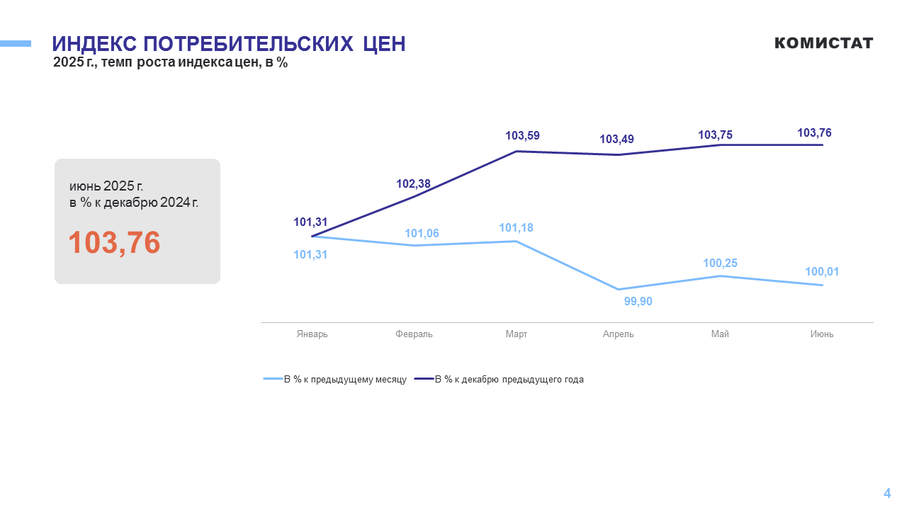 Индекс потребительских цен в Коми в июне 2025 года составил 100,01% по отношению к предыдущему месяцу и 103,8% с начала года. Об этом сообщает Комистат.