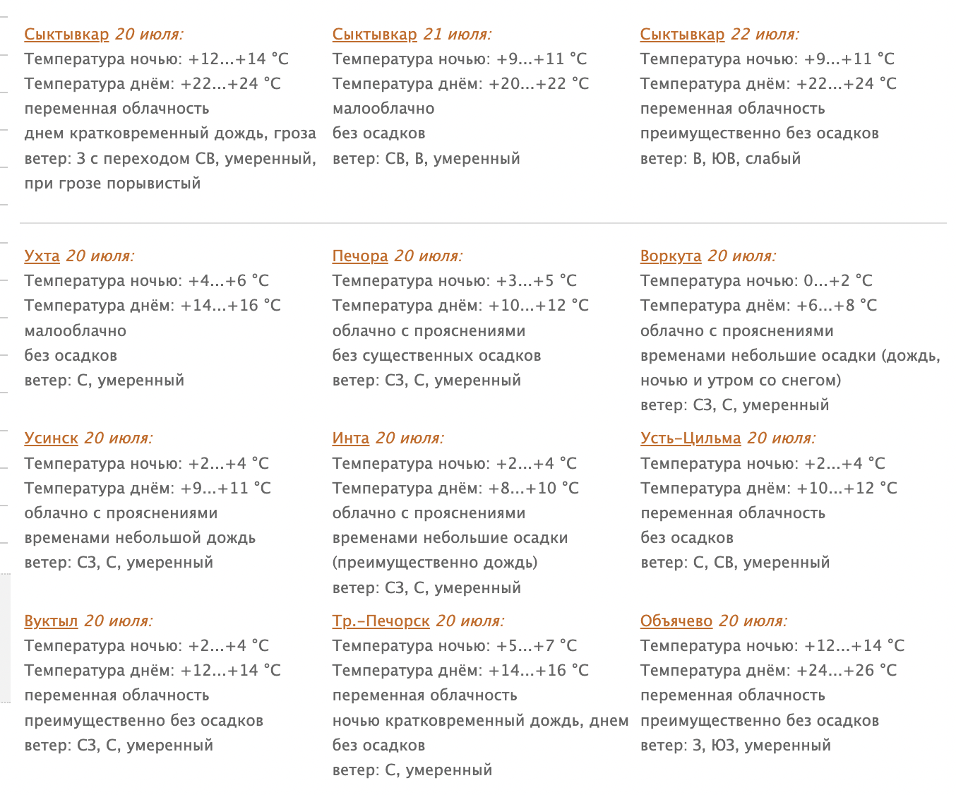 В Сыктывкаре 20 июля переменная облачность. Днем кратковременный дождь, гроза. Ветер западный с переходом на северо-восточный 6-11 м/с, при грозе порывами до 14 м/с. Температура ночью +12...+14°С, днем +22...+24°С.