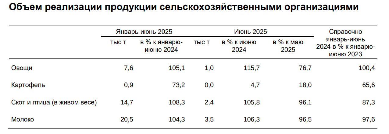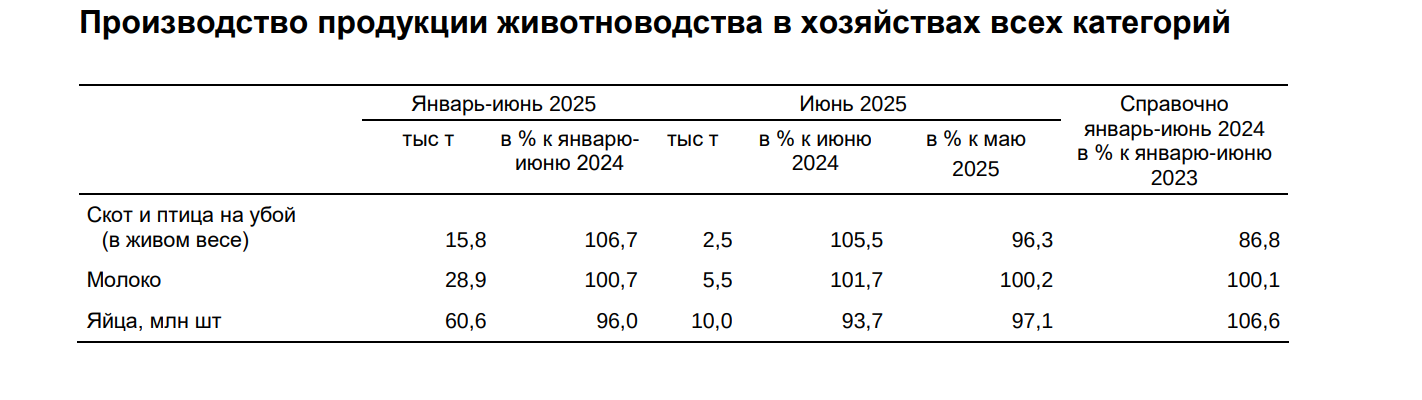 Анализ динамики показывает, что в сельскохозяйственных организациях численность крупного рогатого скота снизилась на 0,2%, коров — на 2,6%, при этом количество свиней увеличилось на 7%. За первые шесть месяцев 2025 года хозяйства всех категорий произвели 15,8 тысячи тонн скота и птицы на убой в живом весе, 28,9 тысячи тонн молока и 60,6 миллиона яиц.