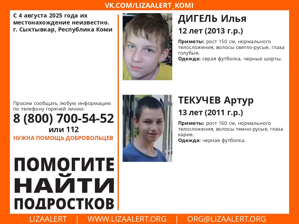 В Сыктывкаре пропали 12-летний Илья Дигель и 13-летний Артур Текучев. Местонахождение подростков неизвестно с 4 августа, сообщает поисковый отряд "ЛизаАлерт".