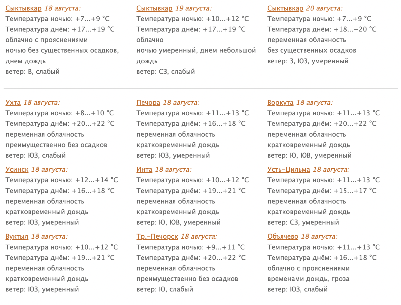 В Сыктывкаре 18 августа облачно с прояснениями. Ночью без существенных осадков, днем дождь. Ветер восточный 2-7 м/с. Температура ночью +7...+9°С, днем +17...+19°С.