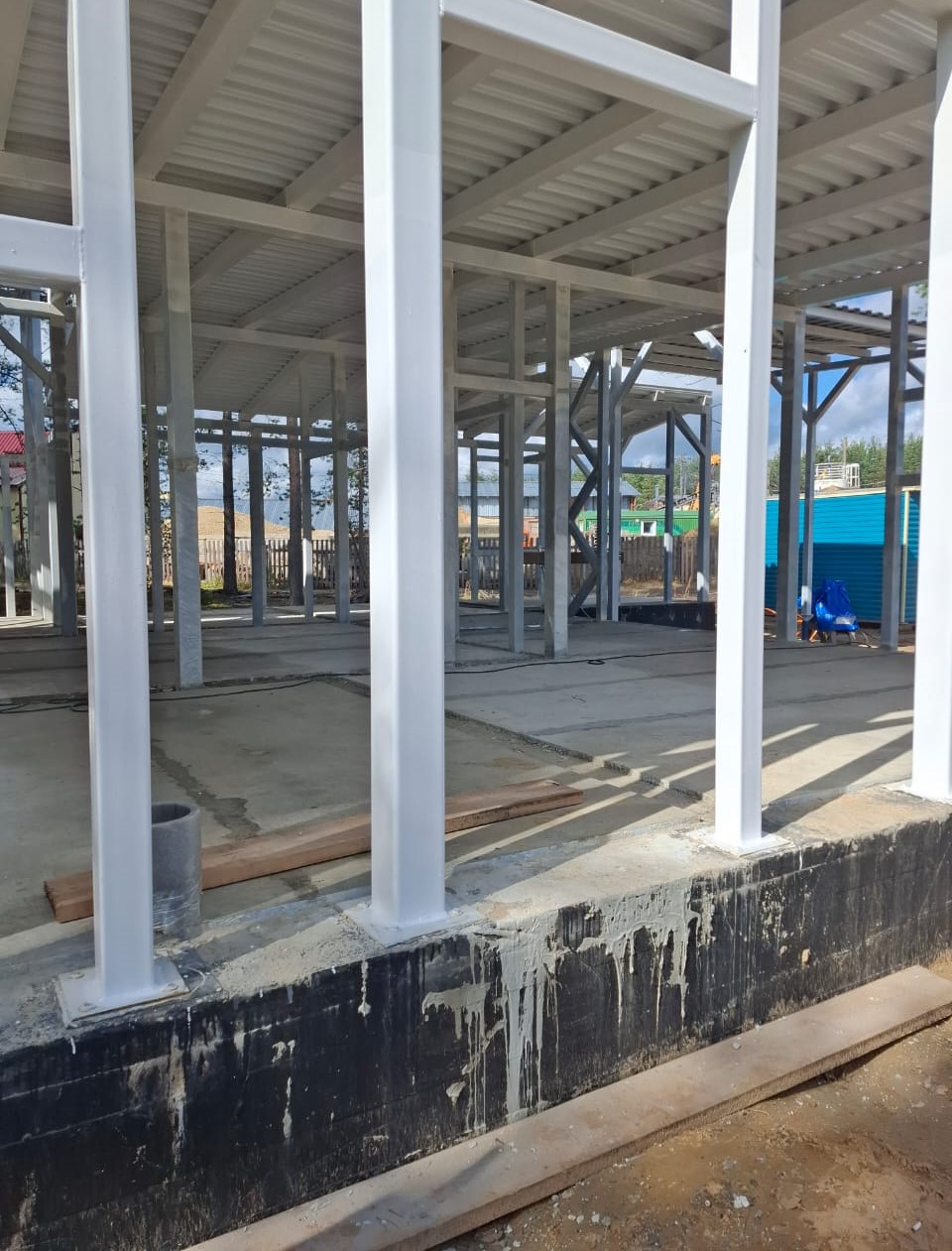 На 1 августа текущего года выполнены следующие виды работ: монтаж каркаса, разводка канализации и водопровода, бурение скважины, также залиты бетоном полы, застелена профлистом кровля, окрашен каркас.