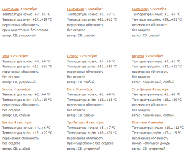 В Сыктывкаре 4 сентября переменная облачность. Преимущественно без осадков. Ветер северо-восточный 5-10 м/с. Температура ночью +7...+9°С, днем +17...+19°С.