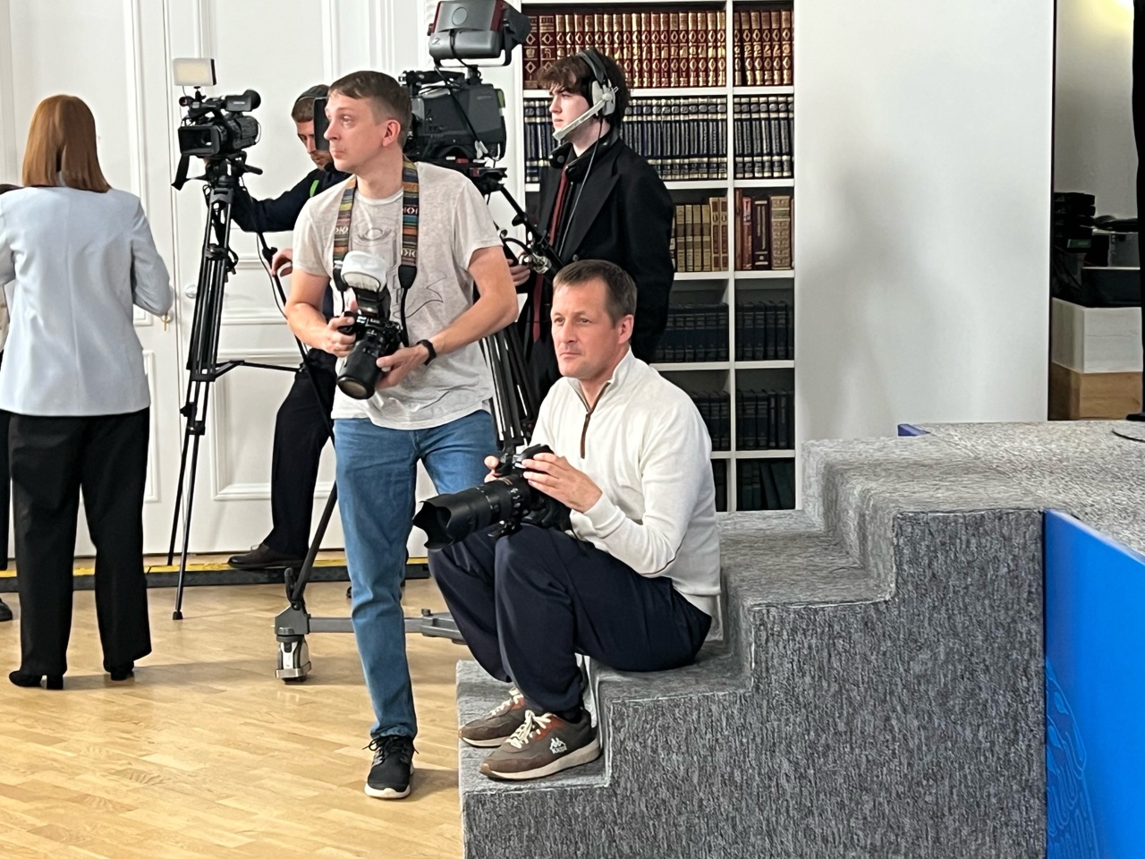 На данный момент в зале библиотеки завершился саунд-чек: звукорежиссуры проверили работу микрофонов, раз по сто проговорив - "раз, два, три…". Фотографы сделали тестовые кадры на разных удвоениях от сцены. В нескольких точках зала выставлены видеокамеры.