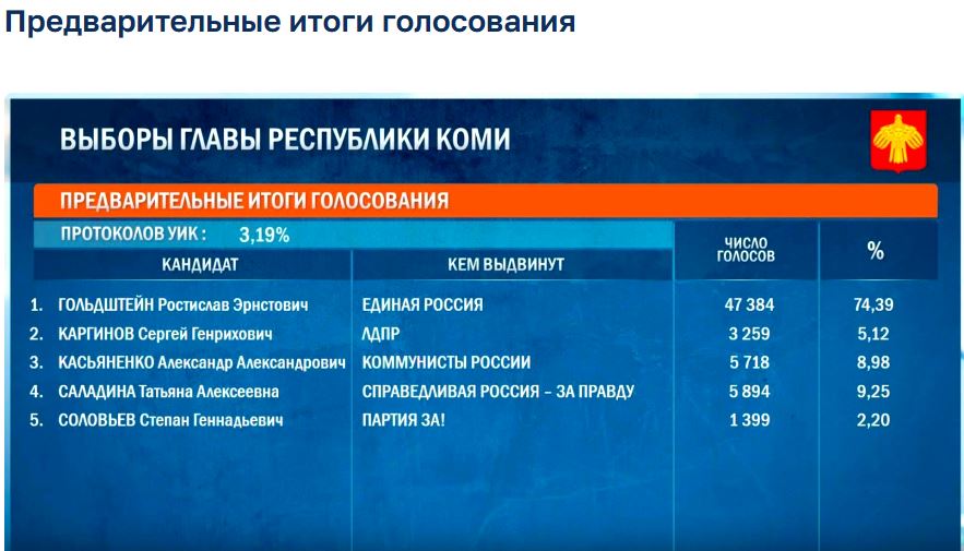 По результатам обработки 3,19% протоколов участковых избирательных комиссий, на выборах главы Коми лидирует Ростислав Гольдштейн. Он значительно опережает конкурентов и набирает 74,39% голосов.