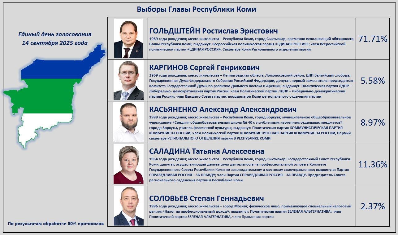 Итоги 80% протоколов участковых избирательных комиссий по выборам главы региона обнародовал Избирком Коми.