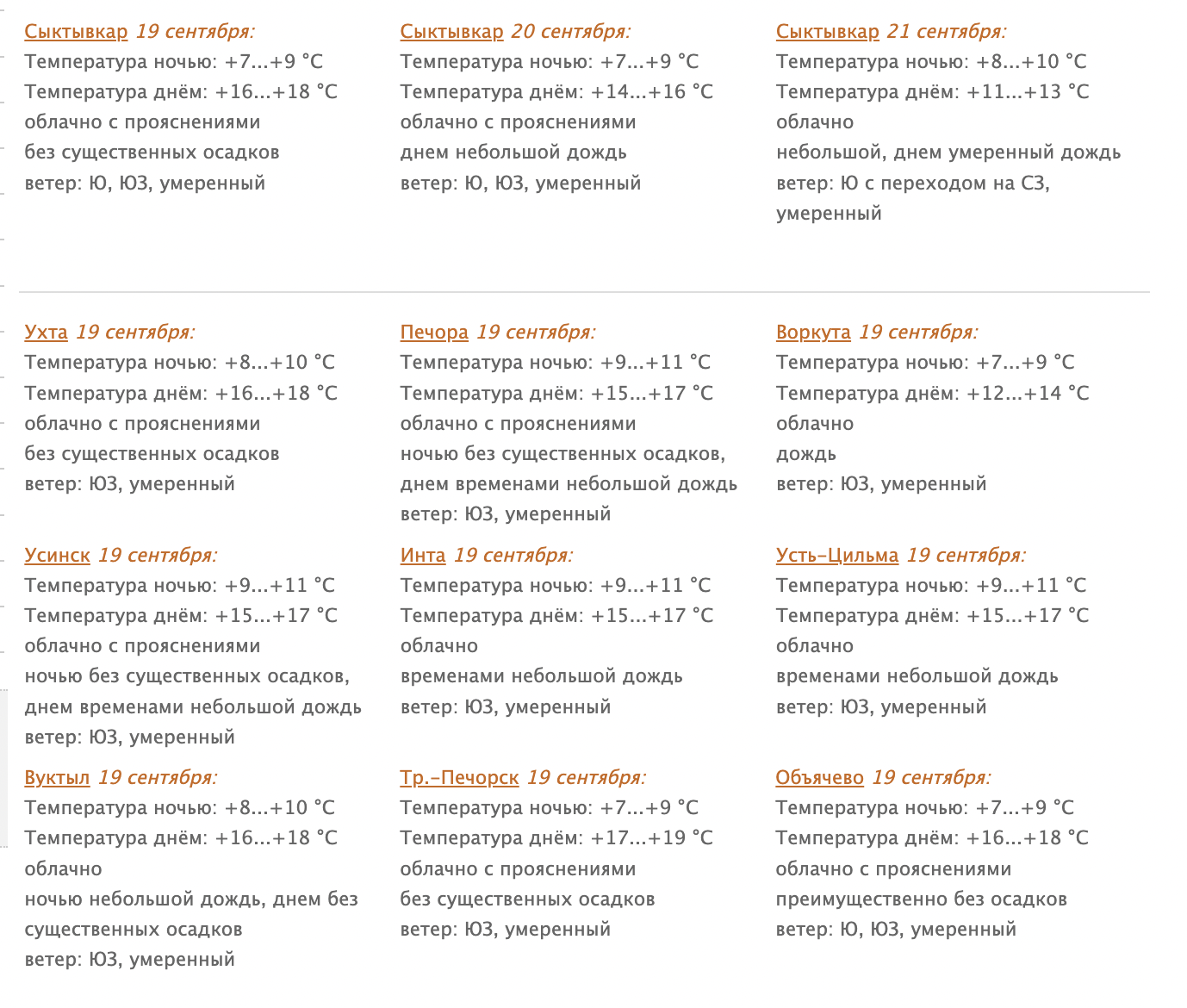 19 сентября в Коми облачно с прояснениями, местами небольшой, на крайнем северо-востоке умеренный дождь.